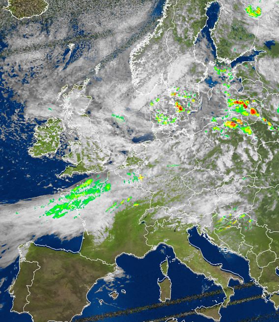 Auf dem Satellitenfoto von heute Nachmittag präsentiert sich nahezu der gesamte Mittelmeerraum wolkenfrei oder nur gering bewölkt. Sehr viele und oft dichte Wolken sind hingegen über der Nordhälfte Europas zu sehen. Dabei ereignetten sich im Nordwesten von Frankreich verbreitet kräftige und ergiebige Regenfälle. Über dem Baltikum waren sogar oft kräftige Gewitter zu verzeichnen.