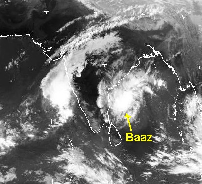 Im Golf von Bengalen liegt der Zyklon 'Baaz' mit Windgeschwindigkeiten von etwa 85 km/h, der in Richtung Indien zieht. Am Freitag liegt er voraussichtlich vor der Küste von Andhra Pradesh.