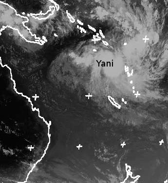 Westlich von Vanuatu liegt der Zyklon 'Yani' mit einer mittleren Windgeschwindigkeit von 100km/h und Böen bis 130 km/h. Er wird sich weiter verstärken. Seine weitere Zugbahn ist unsicher, voraussichtlich zieht er weiter nach Süden auf Neukaledonien zu. (Bildquelle: NERC Satellite Receiving Station, Dundee University, Scotland, http://www.sat.dundee.ac.uk/)