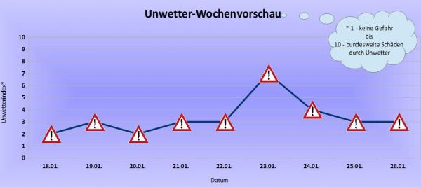 In der laufenden Wetterwoche erwartet uns meist ruhiges und trockenes Winterwetter, dabei bleibt das Unwetterrisiko zunächst gering, am Dienstag fällt im Süden zeitweise Schnee mit entsprechender Glättegefahr, sonst fällt aber kaum Schnee. Es bleibt bis wohl einschließlich Freitag praktisch im gesamten Land dauerfrostig, am Samstag zieht jedoch voraussichtlich ein Tiefausläufer von Westen her mit milderen Luftmassen über Deutschland hinweg und sorgt an der Frontseite des Ausläufern für vorübergehend teils sehr glatte Straßen, dabei ist auch Blitzeis möglich! Ab Sonntag sollte sich die Wettersituation dann wieder entspannen.
