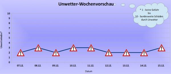 Die Unwettergefahren bleiben für die laufende Woche weitgehend gering. Zwar wird es im Wochenverlauf etwas kälter, aber die eher seltenen Niederschläge fallen auch weiterhin meist als Regen. Sonst bleibt es unter Hochdruckeinfluss bei recht mildem, überwiegend trockenem und ruhigen Herbstwetter.