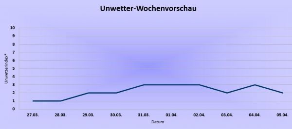 Die mögliche Gefahr durch Unwetter bleibt in der laufenden Wetterwoche nur gering. Besonders am Montag und Dienstag herrscht noch landesweit sehr ruhiges und sonniges Frühlingswetter, bevor es zum Mittwoch hin bevorzugt über der Nordhälfte,  unbeständiger wird. In den Folgetagen bleibt es bei nur leicht wechselhaftem Wetter dann häufig auch freundlich. Es können zwar örtlich einzelne, meist kurze Gewitter auftreten, ansonsten bleibt die Luftmassenströmung jedoch insgesamt schwach.