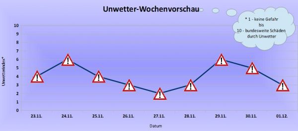 Vor allem am Montag und Dienstag muss bevorzugt im Norden, aber auch im Westen mit teils stürmischem Wind gerechnet werden. Zudem fällt bereit am Montag zum Teil bis in die Niederungen Schnee, so dass es auf den Straßen glatt werden kann. Eine verschärfte Situation ist für Dienstag möglich, wenn eine Front von Nordwesten her Regen und teils Schneeregen oder gar gefrierenden Regen mitbringt, hier ist mögliches Blitzeis nicht auszuschließen. Im weiteren Wochenlauf entspannt sich die Wetterlage wieder, bevor am Wochenende ein erneuter Kälteeinbruch mit Schneefällen bis ins Flachland anstehen kann.