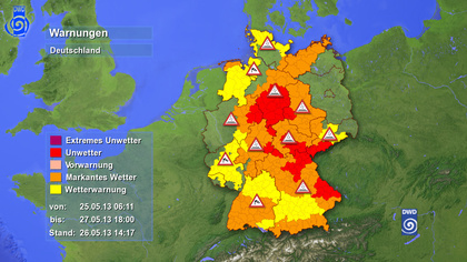 Sonntag Nachmittag und in der Mitte Deutschlands regnet es weiter anhaltend. Vor allem in den mittleren und östlichen Mittelgebirgen bestehen Unwetterwarnungen wegen der hohen Regenmengen, die im Laufe des Wochenendes zusammen gekommen sind und noch weiter dazu kommen: