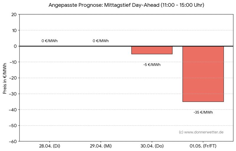 Für die aktuelle Woche zeichnet sich genau dieses Szenario erneut ab (s. Grafik). Die stabile Hochdrucklage mit viel Sonnenschein und einem beständigen Ostwind sorgt deutschlandweit für eine maximale Einspeisung aus Erneuerbaren Energien. Da die Prognosen bis einschließlich zum Maifeiertag am Freitag nahezu wolkenlose Bedingungen und kräftige Windböen aus Ost vorhersagen, ist mit einer massiven Überproduktion zu rechnen. Besonders am kommenden Feiertag, wenn die industrielle Nachfrage traditionell sinkt, dürften die Börsenstrompreise aufgrund des sonnigen und windigen Wetters erneut tief ins Negative rutschen.