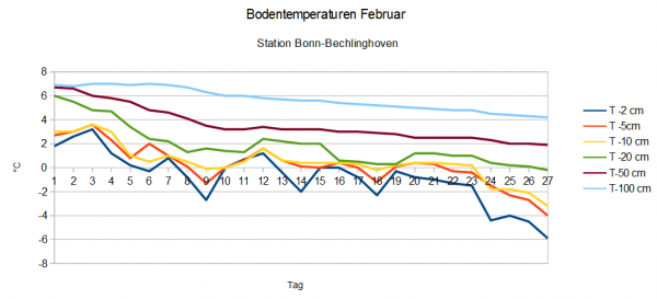 Unsere Grafik zeigt den Verlauf der Erdbodentemperaturen im Februar an unserer Wetterstation in Bonn (Stand jeweils 08:00 Uhr morgens). Wir erheben diese unter anderem in Tiefen von 2, 5, 10, 20, 50 und 100 cm.