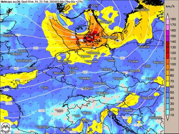 Auf den Karten zu sehen sind die zu erwarten Spitzenwindgeschwindigkeiten (10 m Höhe) in Mittel- und Westeuropa am Donnerstag sowie Freitagfrüh lt. US-amerikanischen GFS-Modells.