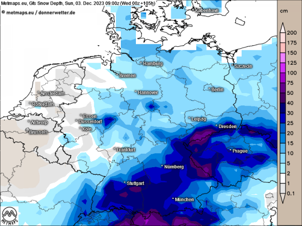 In den Mittelgebirgen und im Süden türmen sich die weißen Flocken in den nächsten Tagen sogar noch höher auf: 20 bis 50 cm können hier bis zum ersten Adventssonntag zusammenkommen. Grund für den Schneezuwachs im Süden ist ein neues Schneetief am Freitag und Samstag, welches dem Süden nochmals 10 bis 20 Zentimeter Neuschnee beschert.