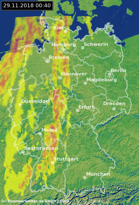 Am Freitag zieht eine Störungszone von West nach Ost über Deutschland hinweg. Dabei fällt gebietsweise Regen. Die Niederschlagsmengen liegen zwischen 1 und 8 Liter pro Quadratmeter. Im Osten kann es in der noch vorhandenen kalten Luftmasse anfangs auch zu gefrierendem Regen mit Gefahr von Glatteisbildung kommen.