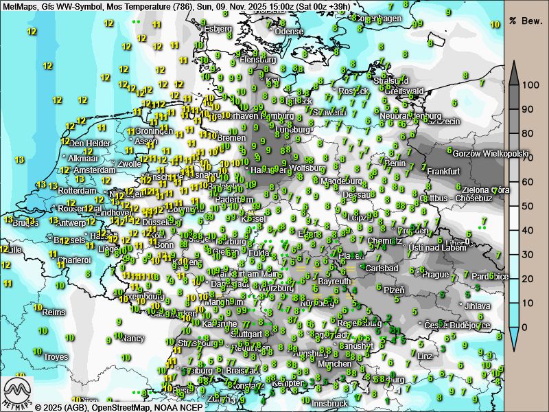 Die Wetter- und Temperaturkarte nach GFS für Sonntagnachmittag: