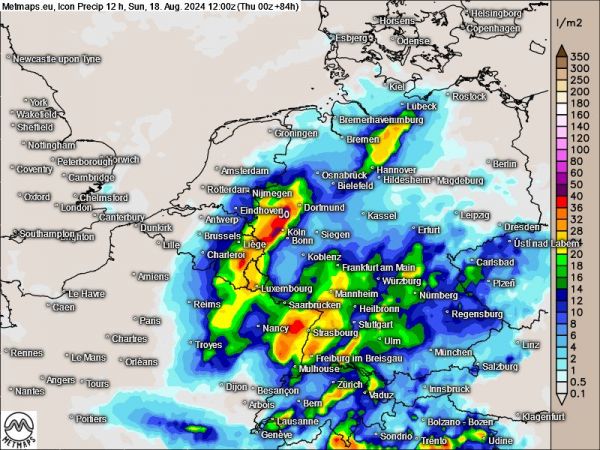 Für die westlichen Landesteile deuten nach aktuellem Stand Regenmengen von maximal 50 l/m² in 12 Stunden an; mit dem Zug über Deutschland können es gerne auch bis zu 90 l/m² in 12 Stunden sein.