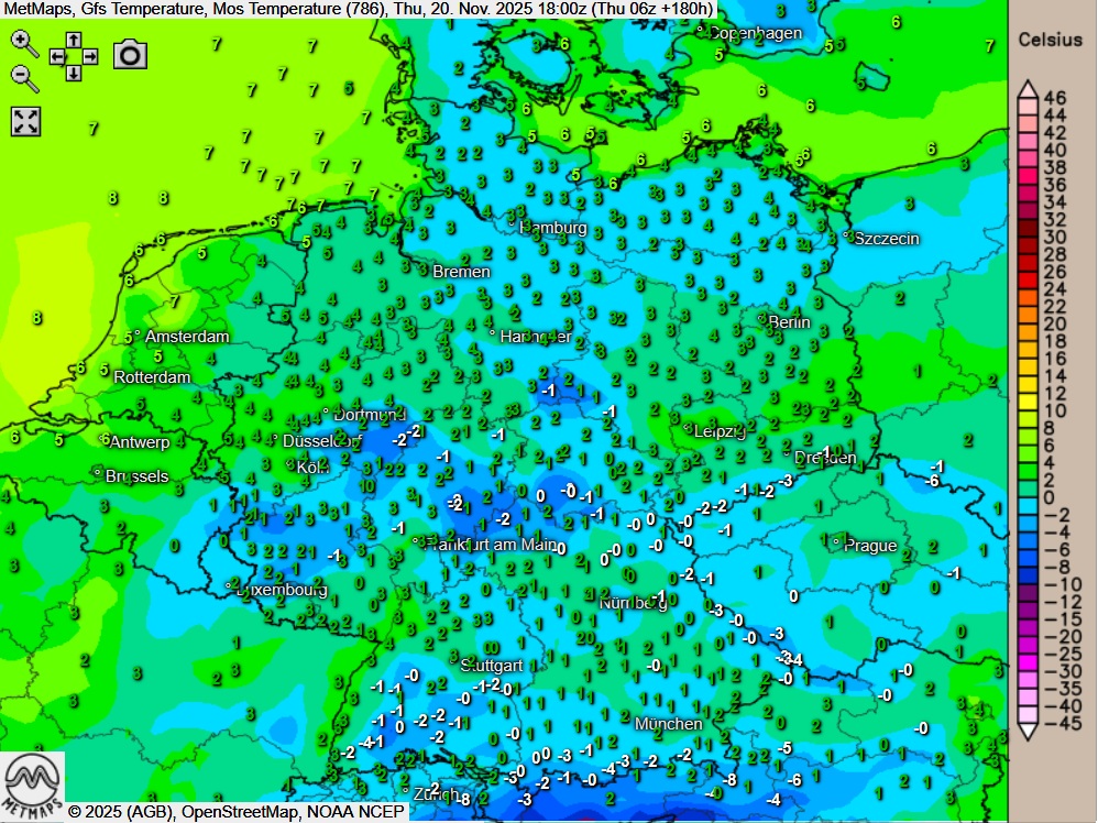 Die Lufttemperaturen für Donnerstagabend (20.11.) sowie die Schneehöhen am übernächsten Samstag (22.11.) nach GFS: