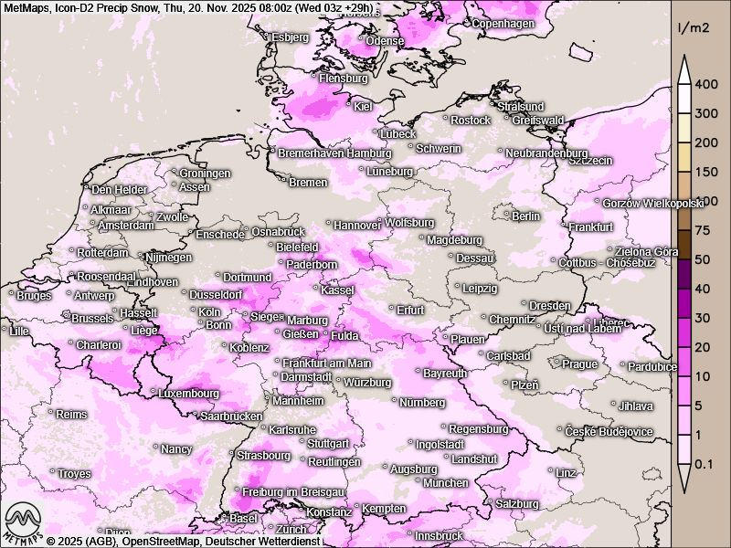 Eine Kaltfront des Tiefs "Talat" überquert heute Westeuropa, die Schneefallgrenze sinkt dabei ordentlich ab: Im südlichen Schleswig-Holstein und Hamburg kann es am Abend und in der Nacht verbreitet weiß werden. In den übrigen Regionen Deutschlands liegt die Schneefallgrenze bei 200 bis 300m über NN.