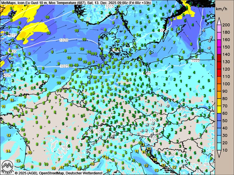 Die Wettertemperaturkarten für Freitag- und Samstagnachmittag (15:00 Uhr) sowie die Böen- / Temperaturkarte für Samstagfrüh nach Icon-D2: