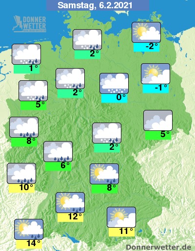 Am Samstag bleibt der Himmel abseits größerer Auflockerungen im Nordosten sowie im Donaugebiet bedeckt. Verbreitet muss im Tagesverlauf mit teils kräftigen Niederschlägen gerechnet werden, die vom Münsterland bis ins Vogtland häufig als Schneeregen oder Schnee niedergehen - Vorsicht Glätte! An den Küsten sowie am Alpenrand sind Sturmböen möglich (Verwehungsgefahr im Norden), sonst weht ein meist mäßiger bis frischer Wind.
