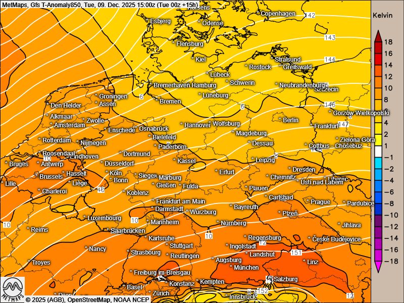 In den sonnigen Regionen steigen die Werte auf sehr milde 14 bis 17 Grad, lokal sind noch höhere Temperaturen möglich. Damit werden in einigen Gebieten Werte im Bereich der bisherigen Dezemberrekorde erreicht: Die Luftmassen weisen eine positive Temperaturabweichung von rund 10 bis 12 Grad Celsius gegenüber dem langjährigen Mittel auf.