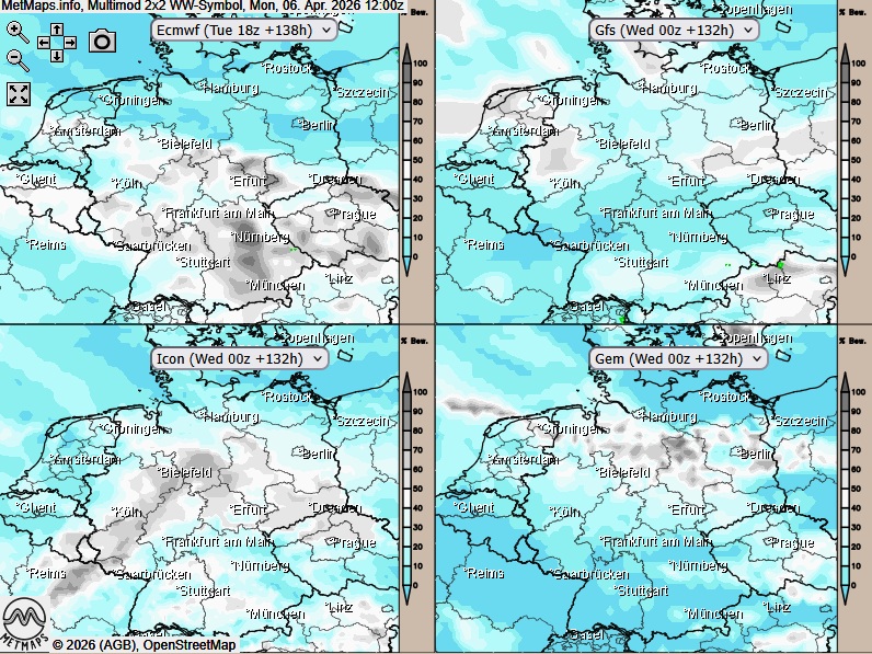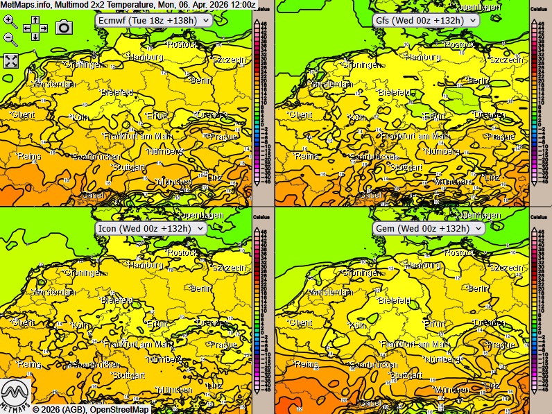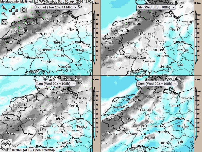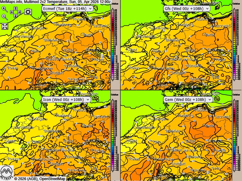 Der große Modellvergleich (ECMWF, GFS, ICON, GEM) für Ostersonntag und Ostermontag (12:00 Uhr):