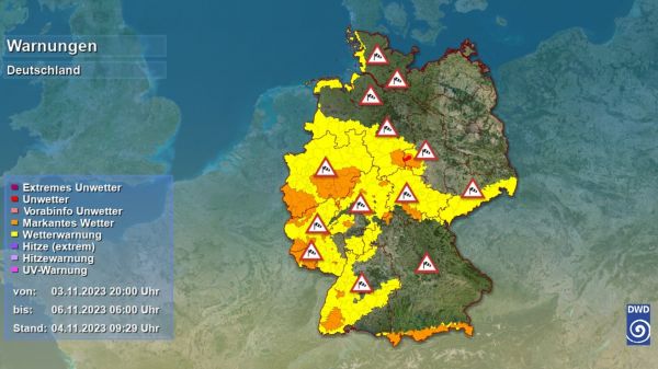 Die Karte zeigt die aktuelle Unwetterwarnlage am Samstag, Stand 04.11.2023, 09:29 Uhr.