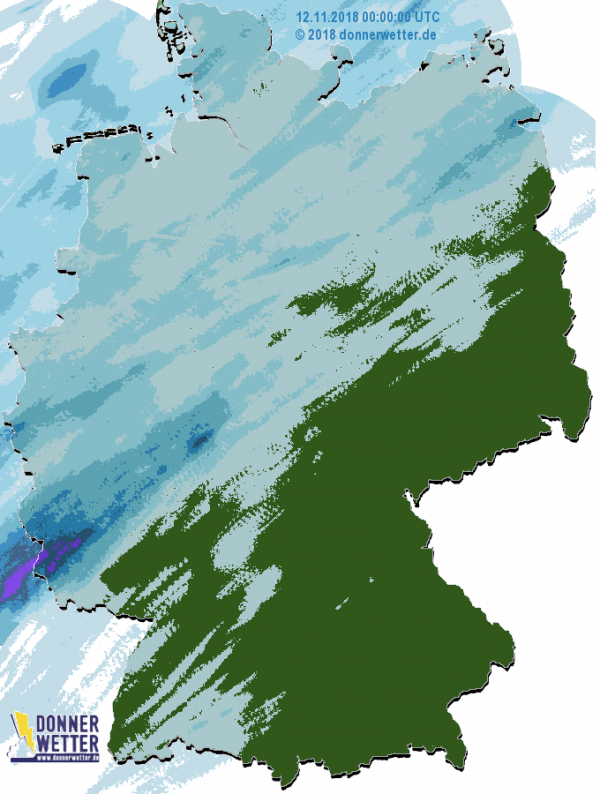 Das Radarbild zeigt aktuell eine von Südwest nach Nordost ausbreitende Zone mit leichten bis mäßigen Regensignalen. Sonst präsentiert sich der Himmel über Deutschland überwiegend wolkenverhangen und nur stellenweise aufgeklart. Vor allem über Bayern, am Bodensee und stellenweise im nördlichen Niedersachsen, sowie Schleswig-Holstein haben sich Nebelfelder gebildet.