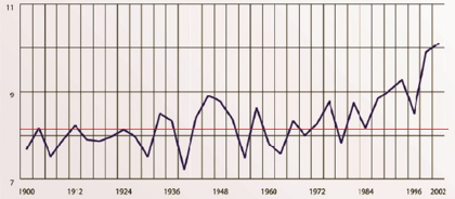 Die Grafik zeigt den Temperaturverlauf in °C als Dreijahresmittel in Deutschland im Zeitraum zwischen 1900 und 2005. Quelle der Daten ist der Deutsche Wetterdienst. Das langjährige Klimamittel der Jahre 1960 bis 1990 von 8,2 Grad C ist als rote Linie markiert. Die Grafik zeigt, dass in den 1990er und 2000er-Jahren „zu kalte“ Jahre eindeutig die Ausnahmen waren. Im Vergleich zu Beginn des 20. Jahrhunderts sind unsere Temperaturen durchschnittlich um 1,5 °C gestiegen. Insbesondere der starke Golfstrom mit positiver NAO hat zu dieser Tendenz beigetragen.